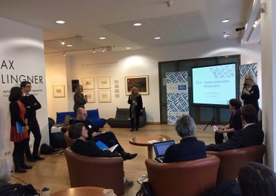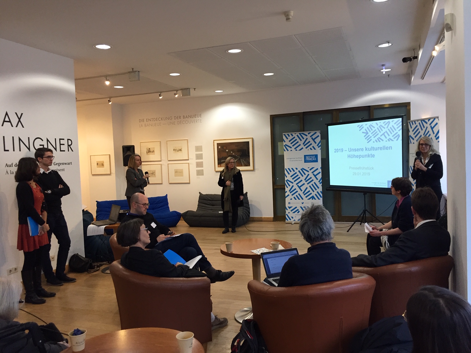 Ku’damm 211 heute früh. Hier lud das Institut français Deutschland und die Kulturabteilung der französischen Botschaft in Berlin die deutschsprachige Presse auf ein französisches Pressefrühstück ein. In entspannter Atmosphäre stellte Catherine Briat, Leiterin der Kulturabteilung der französischen Botschaft in Berlin, mit der gesamten Mannschaft der Kulturabteilung das kulturelle Programm für das kommende Jahr vor. Murielle Rousseau moderierte die Veranstaltung. Von der französischen Gastronomie, 100 Jahre Bauhaus, über die Nachwirkungen von 1989 bis zum mittlerweile europäischen, sommerlichen Rendez-vous aux jardins – auch 2019 wird wieder ein besonderes Jahr für die deutsch-französische kulturelle Zusammenarbeit!